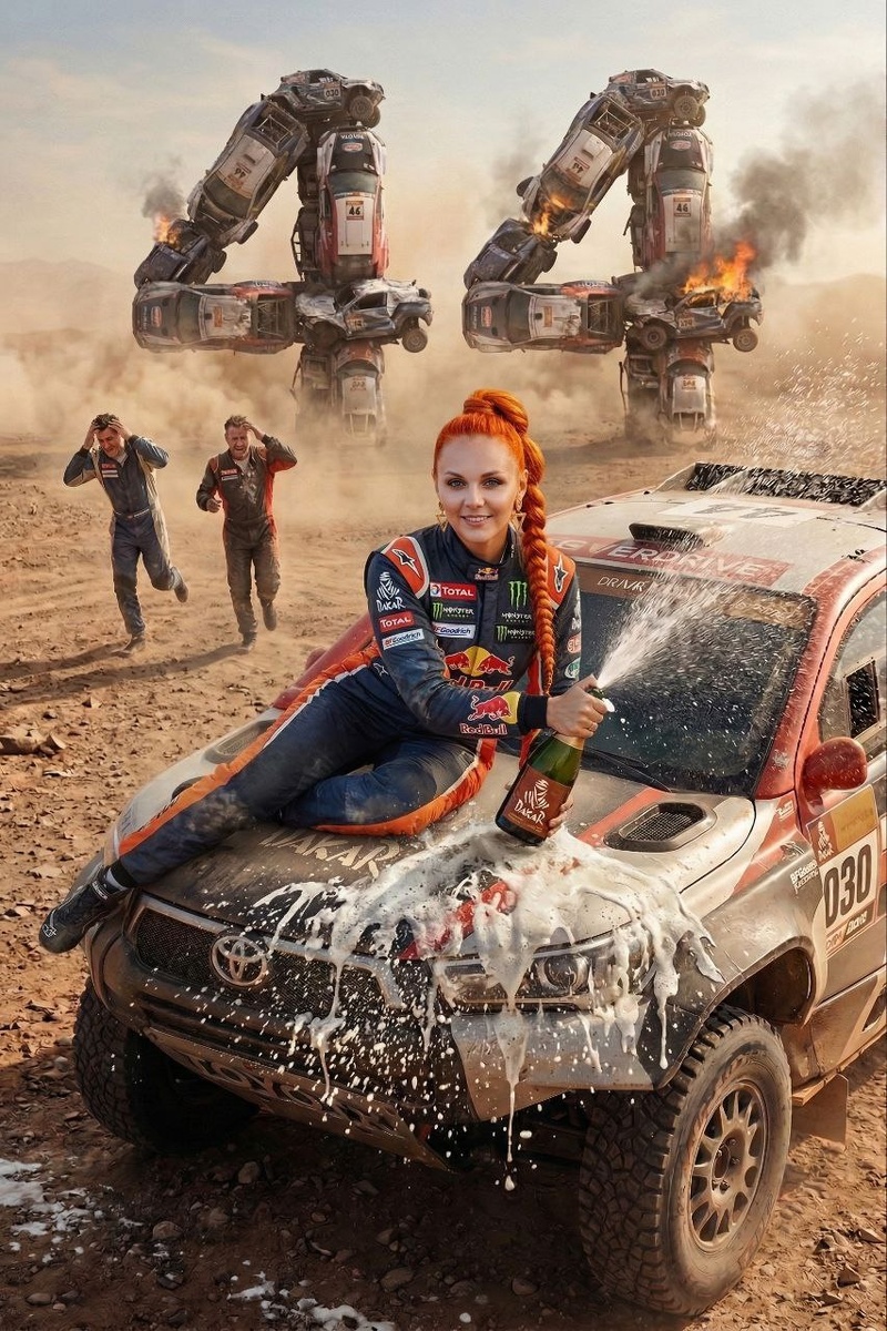 От подписчицы @Irka_samokat Создай реалистичное фото. Соблюдай пропорции тела. Сохрани точную копию лица 1:1 с исходного фото. Гоночная трасса, на гоночном автомобиле Порше с атрибутами Ралли Дакар, на капоте, в изящной позе сидит девушка. Автомобиль стоит в Пол оборота. Чувство победы, взгляд в кадр. В её руках открытая бутылка шампанского, брызги и пена летят в разные стороны, она обливает всех вокруг. Одежда: комбинезон и обувь гонщицы. Волосы: тугой длинный хвост. На заднем плане, в далеке изображена огромная цифра " 44", цифра состоит из гоночных автомобилей. Некоторые автомобили горят, сильно помяты, как после аварии. На заднем плане, вдалеке, от цифры из машин,бежит 2-3 гонщика , у них эмоции отчаяния. На заднем плане атмосфера драматичности, лучи пробивающиеся сквозь темные тучи, несколько горящих автомобилей лежит разбросанных по краям от цифры 44 Реалистичный кадр.Машины детализированные, без мультяшности. Резкость на переднем плане, качество 8к Вертикальный кадр 9:16 Де