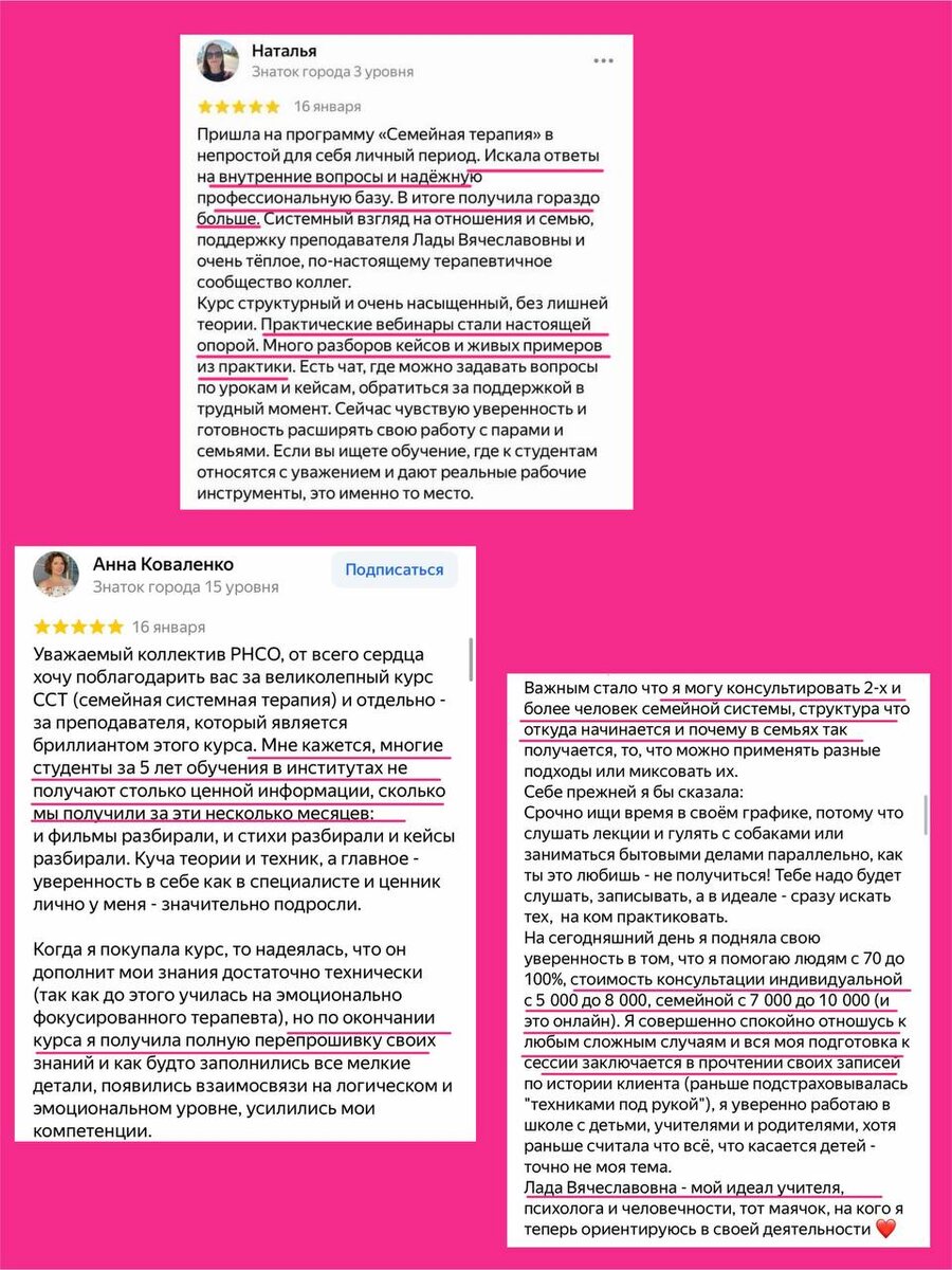 Программа системной семейной терапии в Университете РНСО помогает специалистам выстроить системное понимание семейных процессов и уверенно работать с парами и семьями. Реальные отзывы наших студентов. Подайте заявку на курс сейчас — и через несколько месяцев вы тоже сможете говорить о таких результатах.
