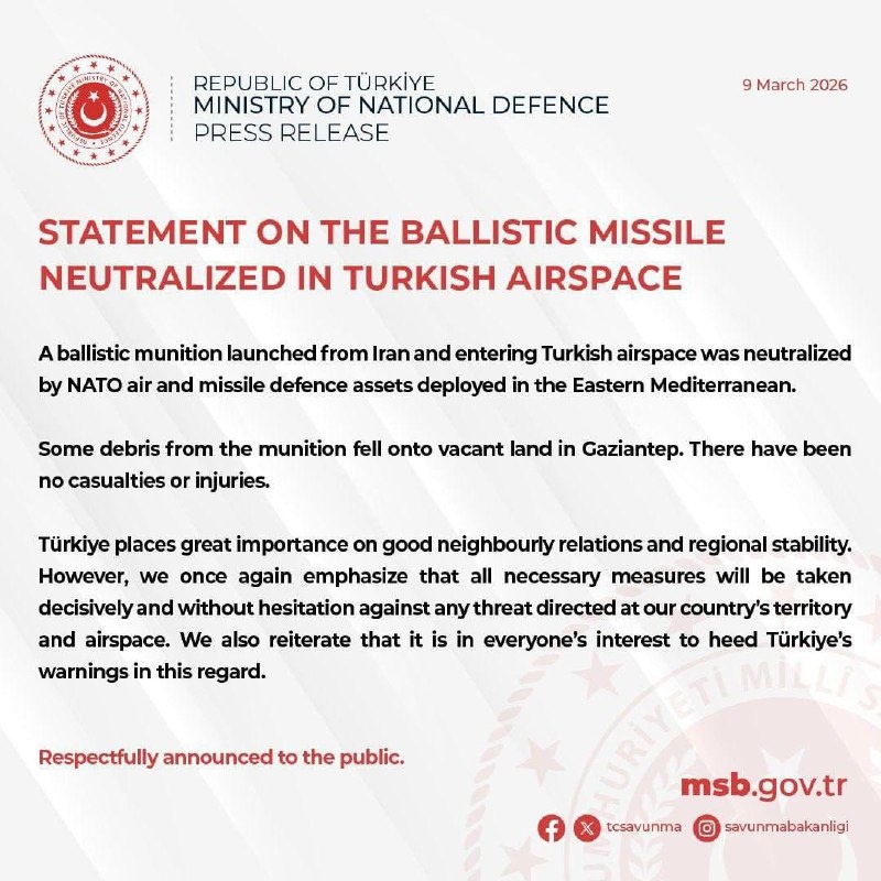 Министерство обороны Турции официально подтвердило инцидент в небе над страной: баллистическая ракета, выпущенная с территории Ирана, была