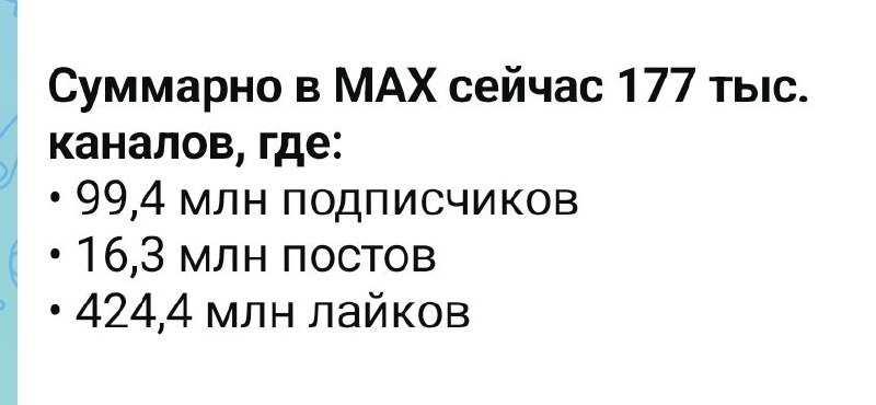 ». ❗Почему это важно именно сейчас? Цифры говорят сами за себя: в MAX уже 177 000 каналов и 99,4 миллиона подписчиков . Платформа растёт взрывными темпами. Те, кто зайдёт сейчас, получат аудиторию, охваты и свободные ниши. Опоздавшие будут догонять и платить за трафик в разы больше. Если вы до сих пор не решились — вот два факта, которые помогут принять решение: 1️⃣ MAX уже стал второй по величине платформой в России. 85 миллионов пользователей, 55 миллионов активной аудитории ежедневно . Это не "эксперимент" — это новая реальность рынка. 2️⃣ На вход в интенсив бесплатно осталось всего 8 мест и 2 места на полный интенсив (3 дня) с разбором вашей стратегии продаж, материалами по упаковке канала лид- магнитов и методами трафика. Завтра их может уже не быть. Что вы теряете, если не придёте? — возможность занять нишу в новой быстрорастущей платформе, пока конкуренты ещё думают — готовые схемы трафика и лид-магнитов, которые сэкономят вам месяцы тестов — доступ в закрытый чат с обрат