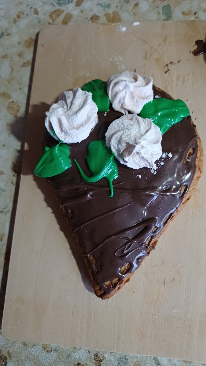 Днём снова взялась за пряники. Галочка же не поставлена). На этот раз взяла в Монетке глазурь в тюбиках, коричневую и зелёную. Пряники испекла. Тюбики в горячей воде подержала, потом проколола, стала наносить, а она едва выдавливается. Мучиться не стала, кончик срезала. Дело пошло быстрее, но глазурь очень густая, плохо размазывается. Зато для листьев жидковата. Вместо безе решила положить зефир. Художников и эстетов просьба отвернуться. Вышло устрашающе и в отличие от двух предыдущих раз совсем не вкусно. Особенно, когда глазурь была свежей.