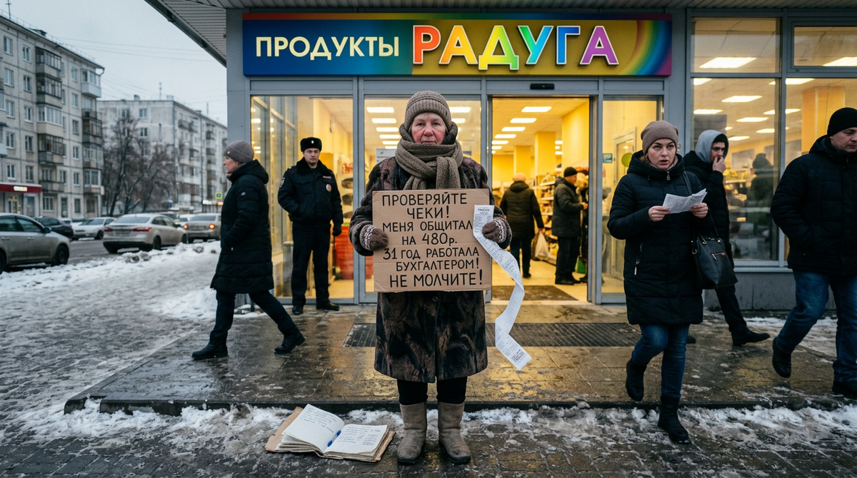 Встала на тротуаре, как обещала. С табличкой от руки: «Магазин РАДУГА обманывает покупателей. Проверяйте чеки».