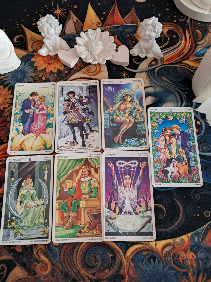Всё это перекликается с предыдущими раскладами: тот самый мужчина (Король Пентаклей, Маг, Рыцарь Кубков) может быть частью этого родового благословения. Род как бы говорит: «Иди к нему, строй с ним семью, вы будете счастливы». Примите эти подсказки с благодарностью и доверием. 🌸