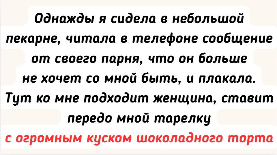 - Однажды я сидела в небольшой пекарне, читала в телефоне сообщение от своего парня, что он больше не хочет со мной быть, и плакала. Тут ко мне подходит женщина, ставит передо мной тарелку с огромным куском шоколадного торта и говорит: «Милая моя, съешь все до последней крошки и забудь о нем!» После этого я плакала уже от умиления, но торт все-таки съела.