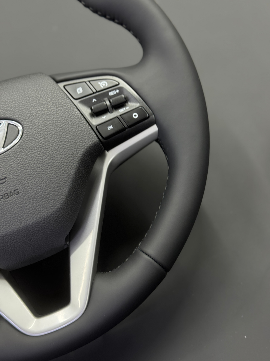 Перетянули руль и ручку КПП на Hyundai Tucson в натуральную кожу. Сохранили штатный обогрев руля и сделали утолщение для более удобного и уверенного хвата. Теперь руль выглядит как новый и ощущается гораздо комфортнее в руках.