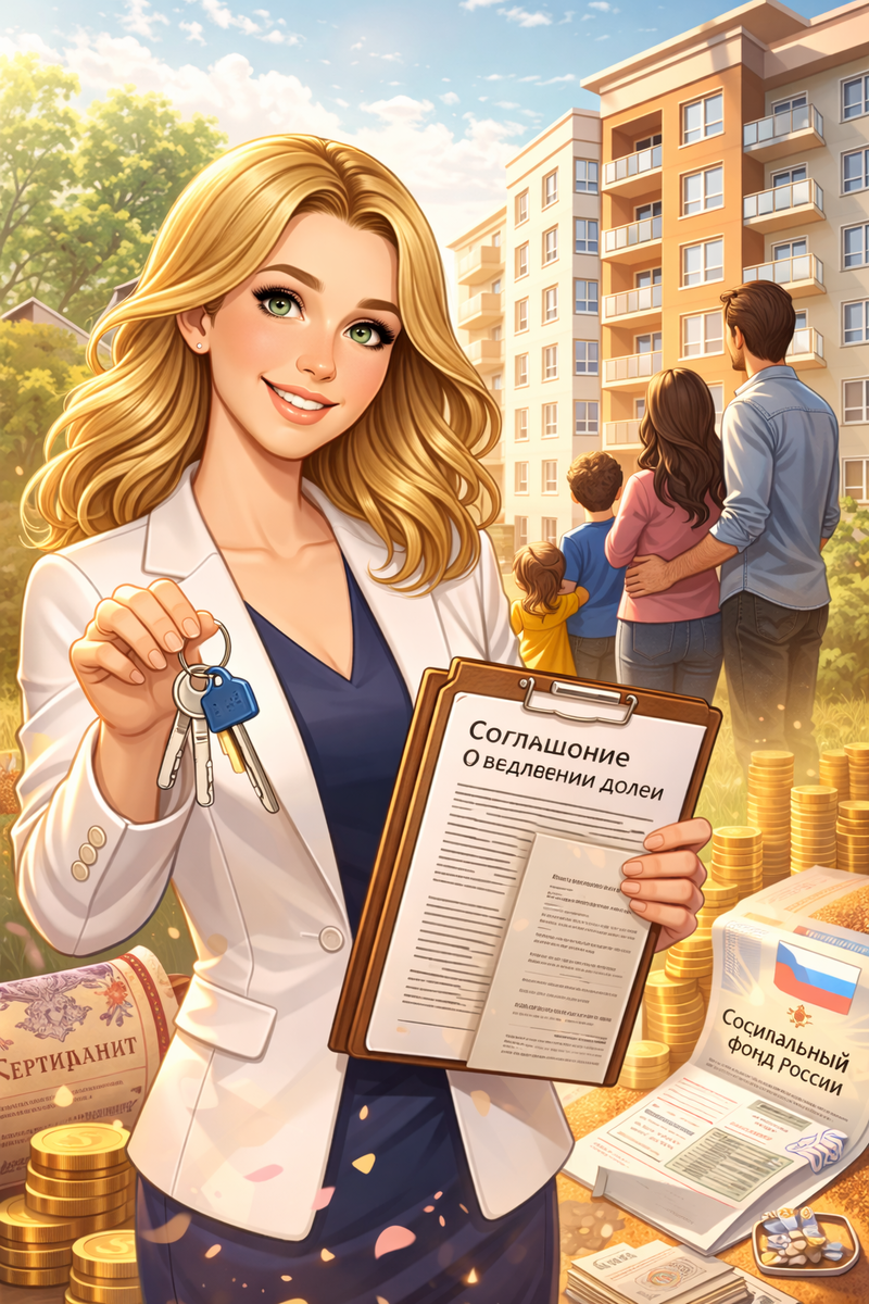 Пенсионный фонд (теперь — Социальный фонд России) переводит деньги. И родители подписывают обязательство: выделить доли детям. Проходит год.