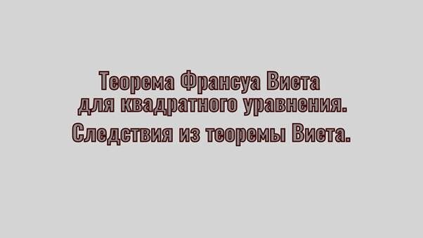 Формулировка теоремы. Для квадратного уравнения Записывать это следующими формулами. А теперь давайте докажем эту теорему. Мы знаем, что корень квадратного уравнения находится по формуле: Для первого корня возьмем со знаком минус, для второго — со знаком плюс. Подставим эти значения в сумму корней. Так как у них общий знаменатель, то мы можем записать под общей чертой дроби. Корень из дискриминанта у нас с разными знаками, поэтому в сумме даст 0. Затем можем сократить на 2 и в итоге получим: Теперь рассмотрим произведение. Опять подставим значение корней, которые мы находим с помощью дискриминанта в формулу умножения корней. Перемножим числители и знаменатели в каждой дроби друг с другом. Обратите внимание на числитель. У нас две скобки. В первой знак минус, во второй знак плюс. Это формула сокращенного умножения – разность квадратов. Подставим значение дискриминанта Раскроем скобки, выполним преобразования, в итоге останется: Что и требовалось доказать. Теорема Виета для приведенного