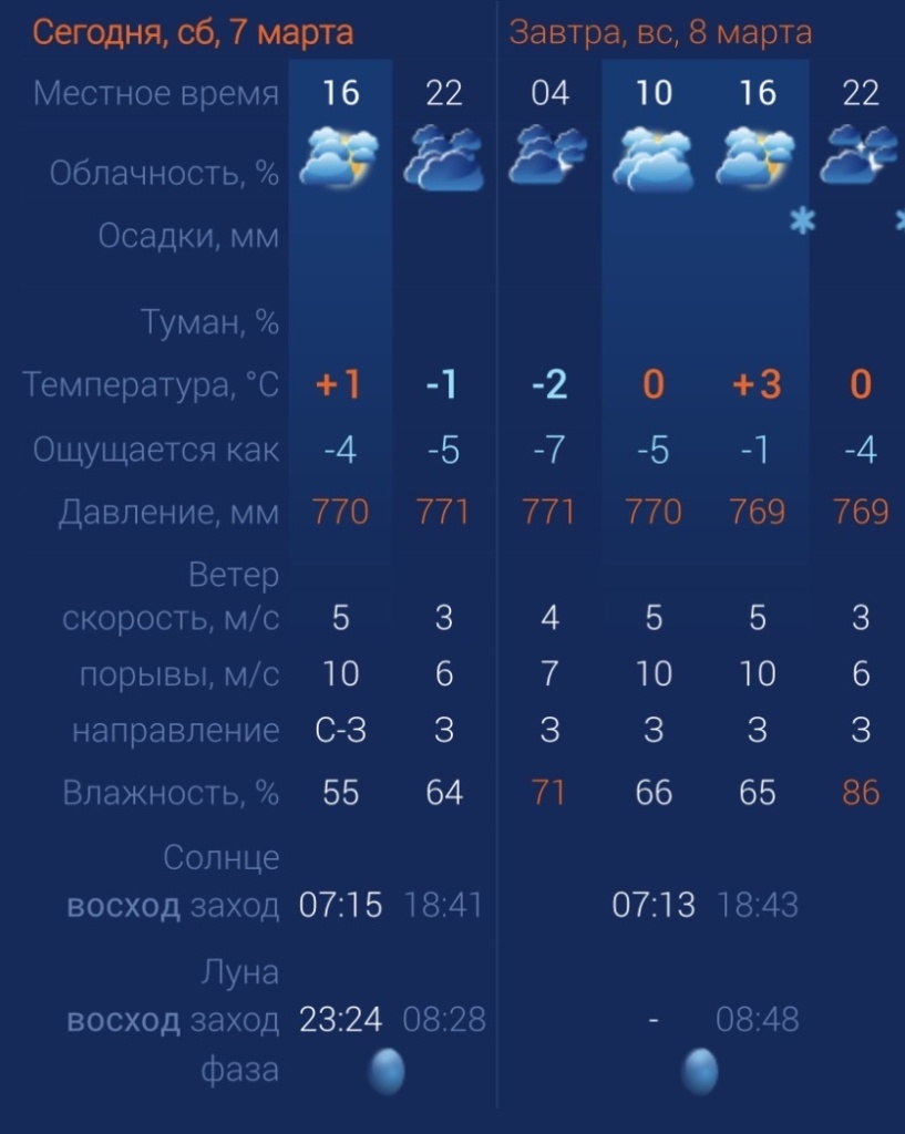 В Международный женский день погода преподнесет для астраханцев сюрприз в виде снега. Осадки ожидаются к ночи. На протяжении всего дня – облачная погода. Утром температура в городе составит 0 градусов. Днем потеплеет до +3. К вечеру температура вновь упадет до 0 градуса. Астраханцев ждет западный ветер со скоростью 5 ‑10 м/с. Атмосферное давление составит 770 мм рт. ст. Влажность воздуха в пределах нормы. На территории всего региона будет западный ветер со скоростью 7–10 м/с. Температура воздуха ночью опустится до ‑3 градусов, а днем повысится до +5. Погодные приметы: Сообщение 8 марта в Астраханской области возможен снег появились сначала на Астрахань.Ру последние новости региона.