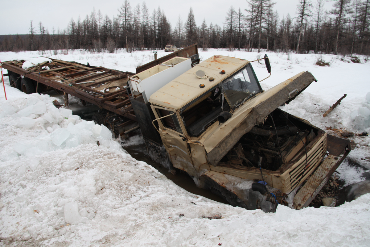 На зимниках Якутии я как-то насчитал десяток брошенных грузовиков на нескольких сотнях километров. Разные стадии распада: одни вросли в мерзлоту так, что кажутся частью рельефа. Другие — явно свежие, с читаемыми номерами, но уже без колёс.