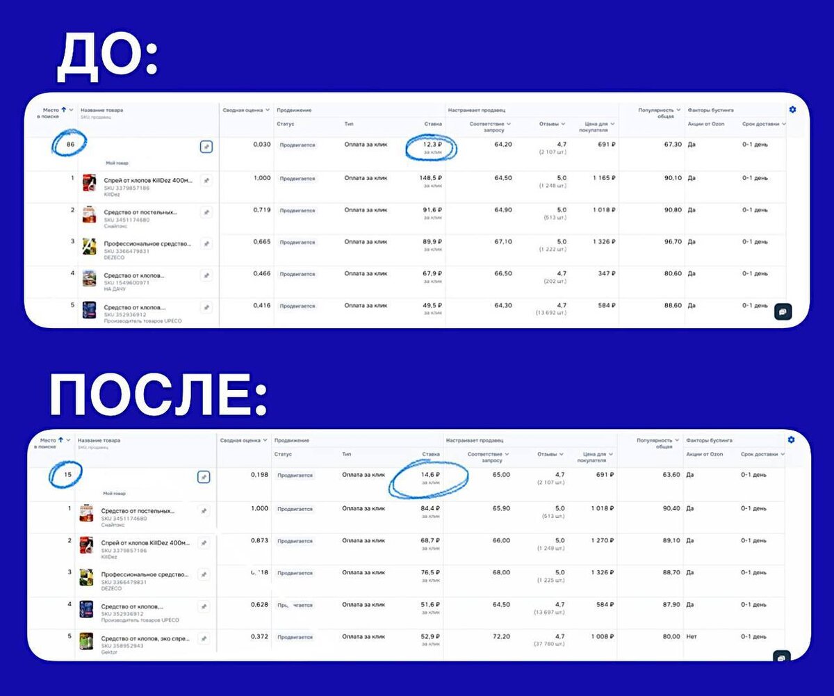 Результат пользователя Миг Клик: с 86 на 15 место в поиске при ставке за клик ниже, чем у конкурентов. 🚀 Было: по целевому запросу карточка товара находилась на 86 месте в поиске. Чтобы поднять ее вверх: SEO-оптимизировали карточку [как это сделать рассказываем в курсе по SEO на платформе МигКлик]. При этом ставку за клик увеличили несильно, и она все еще значительно меньше чем у конкурентов (смотрите фото). Стало: позиция карточки выросла с 86 места до 15-го, без большого повышения ставки, сохраняя ДРР. 🔥Как вам результат? Отметим, карточка начала занимать более высокие позиции не за счёт увеличения бюджета, а потому что Ozon стал показывать товар нужной аудитории. Именно так SEO влияет на вашу рекламу. Как понять какие ключи прокачивать, чтобы поднимать свои позиции в поиске без большого увеличения ставки — разбираем в курсе по SEO для Ozon на платформе МигКлик. Курс по SEO, курс по рекламе и наши отчеты, доступны каждому пользователю всего за 4990₽. Наш сайт: https://mig-click.r
