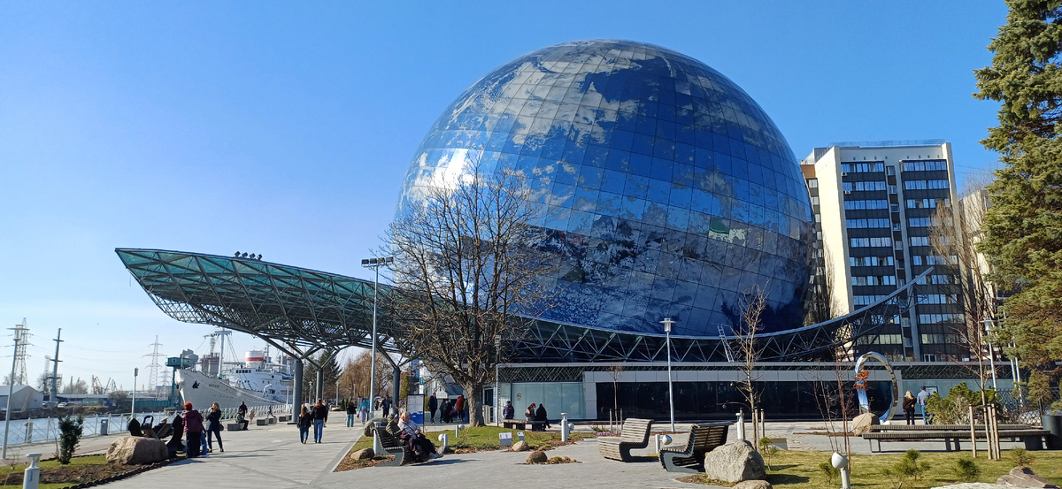 И вот мы уже у набережной реки Преголя, вдоль которой расположены многие экспозиции Музея мирового океана и красавец-шар, изображающий нашу планету.