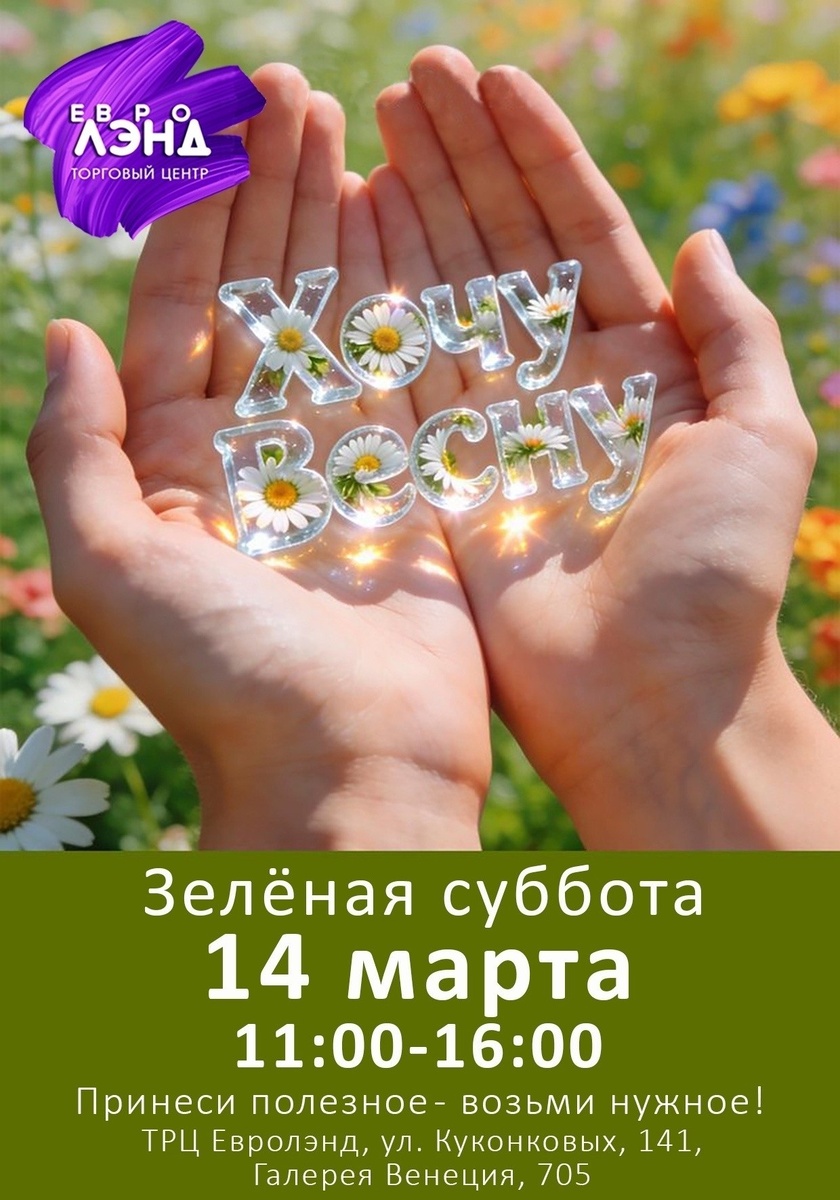 » 14 марта в «Евролэнде» (галерея «Венеция») с 11 до 16 часов пройдет первый в этом году экомаркет по обмену вещами «Зелёная суббота» (0+). Участники смогут принести одежду, обувь, аксессуары, книги и другие вещи в хорошем состоянии. Взамен можно выбрать что-то полезное для себя. Старые вещи пойдут в переработку, хорошие – в «Колыбель». Также в программе – мастер-класс по росписи шопперов. Самым активным – подарки.