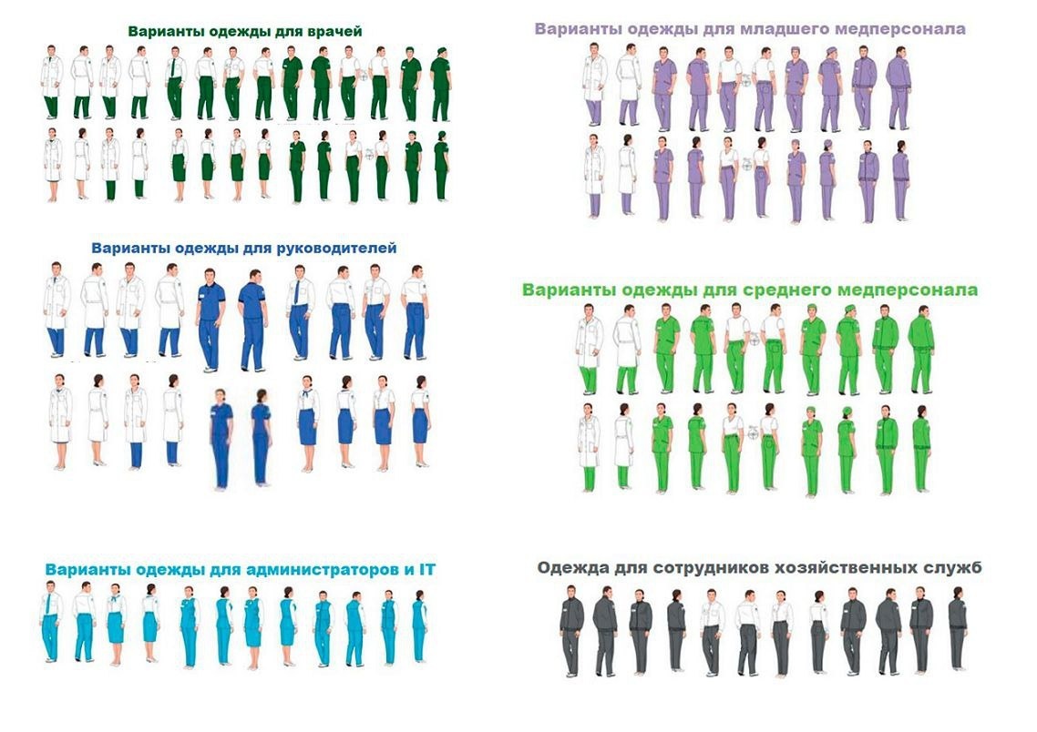 Руководящему персоналу Минздрав рекомендует носить форму фиолетового цвета, врачам — темно-зеленого, а среднему медперсоналу — салатового цвета.