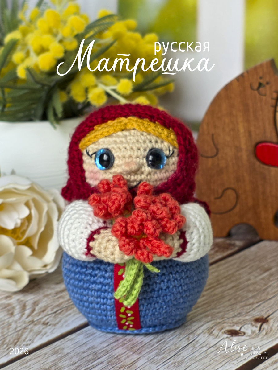 Цвета. красный/золотой/зеленый/белый. Такая матрешка — это не просто сувенир с ярмарки, а культурный код, понятный каждому. А какие символы на матрешках знаете вы? Техника: вязание крючком Размер: 9,5 см Дата проекта: 14.02.2026 Материалы: наполнитель, глазки