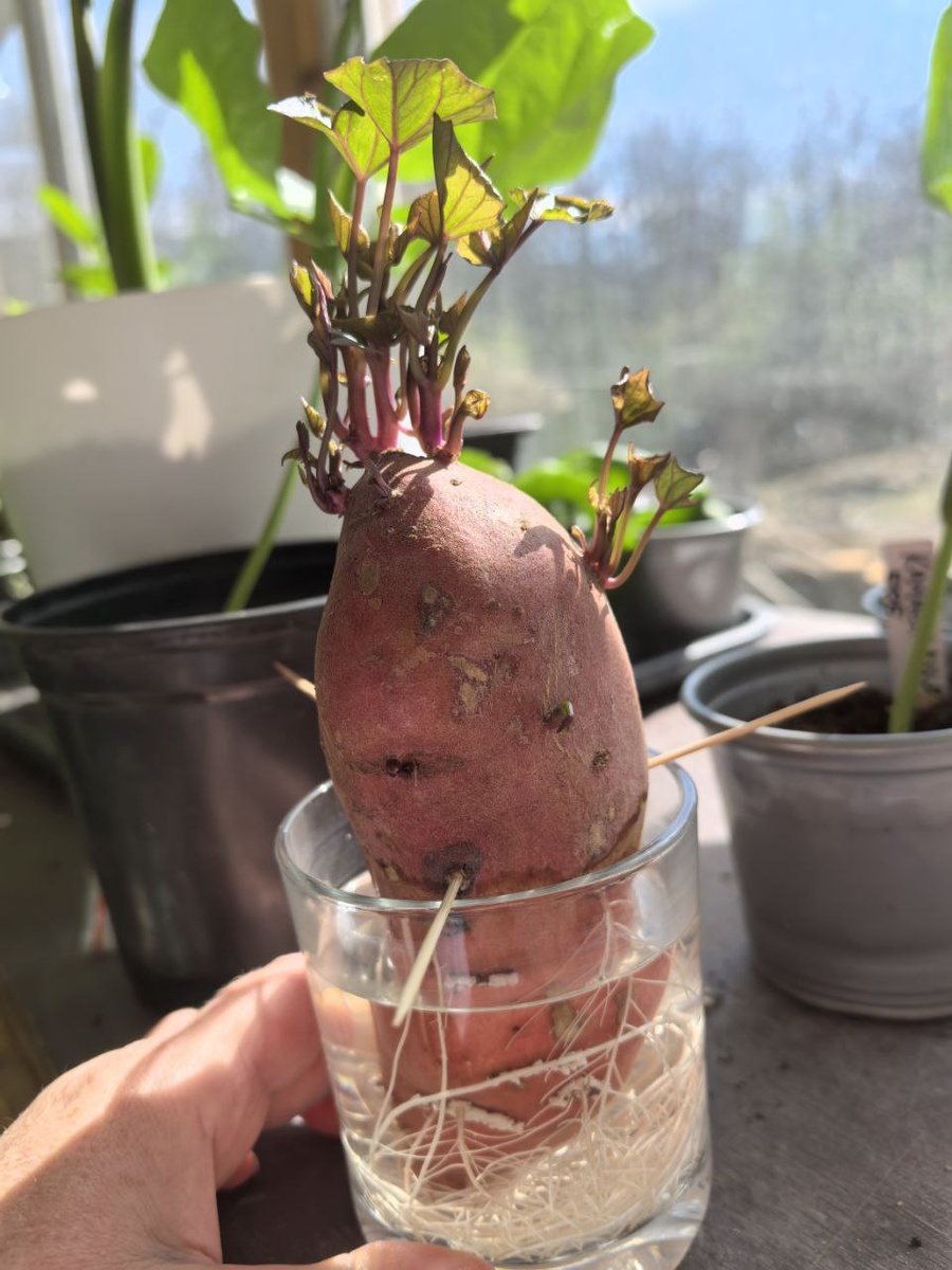? Хочу задать встречные вопросы. А сколько вы хотите получить ростков? Есть ли у вас достаточного места для хранения ростков? Есть ли условия, чтобы хранить эти самые ростки? Если вам надо много ростков и вы ответили утвердительно на следующие вопросы, то можно начинать выращивать и с осени. Весной у вас будет много ростков, но готовьтесь обрабатывать от клеща, белокрылки, досвечивать, держать температуру окружающей среды не меньше +22° (желательно +25) и занимать все свободное пространство баночками с бататом. Кстати, многие кто зимой держит дома декоративные сорта батата, столкнулись с вредителями батата. Только тщательно следить за состоянием растений и обрабатывать. Это относится не только к батату. У каждого свои способы. Если вы не хотите возиться всю зиму огородными делами, то батат выкладываем на проращивание в период с конца февраля до конца марта. Можно и в апреле. Но здесь есть но. Чем позже выкладываете и вам надо много ростков, тем больше клубней вам надо заложить. Есть