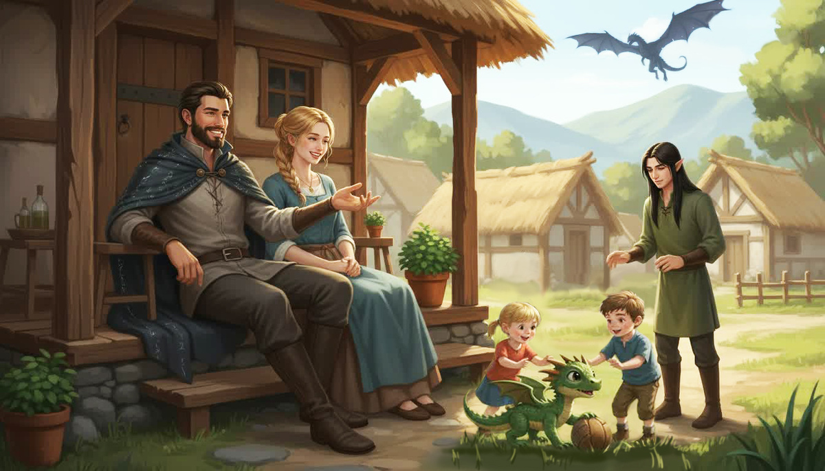 На полянке перед домом было шумно. Двое детей — мальчик и девочка, лет двух одинаковые, как две капли воды — носились друг за другом с визгом. А между ними, путаясь под ногами, бегал небольшой дракон. Зелёный, чешуйчатый, размером с крупную собаку, с совершенно счастливой мордой.