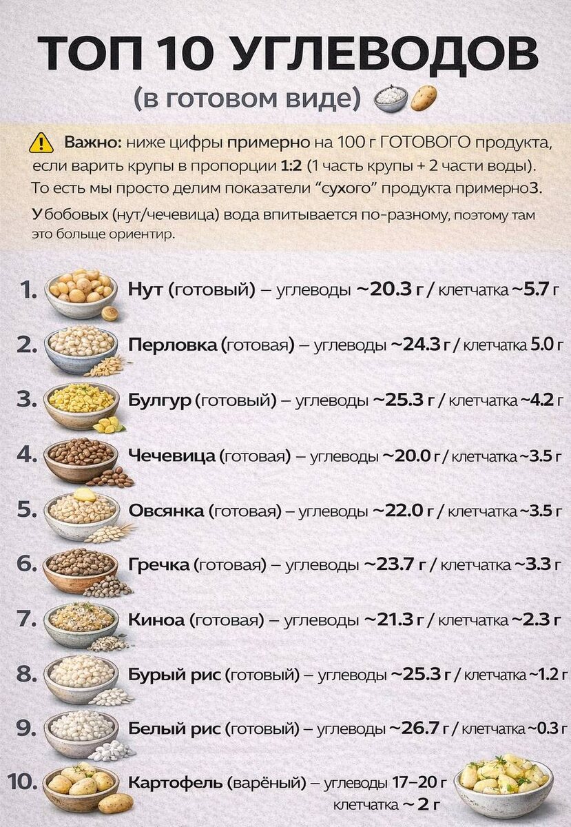 Сохраняй шпаргалку 🫶 ТОП 10 УГЛЕВОДОВ (в готовом виде) - цифры на картинке