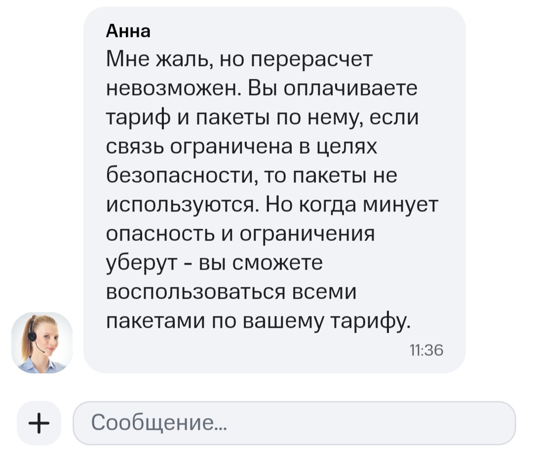 Представьте ситуацию: в вашем регионе объявлена ракетная опасность, работают системы ПВО, или же по предписанию властей ограничивается работа сотовых сетей для затруднения наведения вражеских БПЛА. Интернет пропадает на несколько часов или даже дней. Вы обращаетесь к оператору с просьбой вернуть деньги за неоказанную услугу, но сталкиваетесь с вежливым, но непробиваемым ответом: «Перерасчет невозможен. Вы оплачиваете тариф и пакеты, а при отсутствии связи вы просто не тратите включенный трафик. Как только ограничения снимут, вы сможете использовать свои гигабайты».