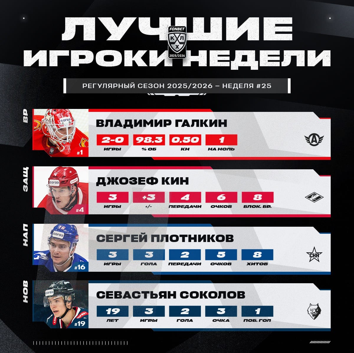 КХЛ определила лучших игроков 25-й недели сезона 2025/2026