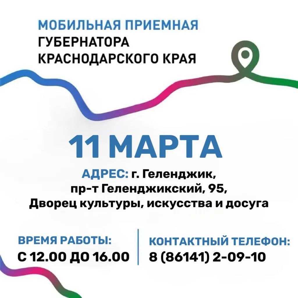 ! В городе-курорте будет работать мобильная приемная губернатора Краснодарского края. Напрямую обратиться к специалистам краевых органов исполнительной власти, получить консультацию и рекомендации по волнующим вас вопросам можно будет 11 марта с 12:00 до 16:00 по адресу: Дворец культуры, искусства и досуга, проспект Геленджикский, 95. Предварительно свои обращения можно обозначить в отделе писем и приема граждан администрации по адресу: ул. Революционная, 1, кабинет 116 или по телефону 8(86141)2-09-10. 💬 Наш чат для общения 🚀 Подписаться на Жизнь Архипки 📥 Прислать фото, видео, новость 📲 Жизнь Архипки в MAX