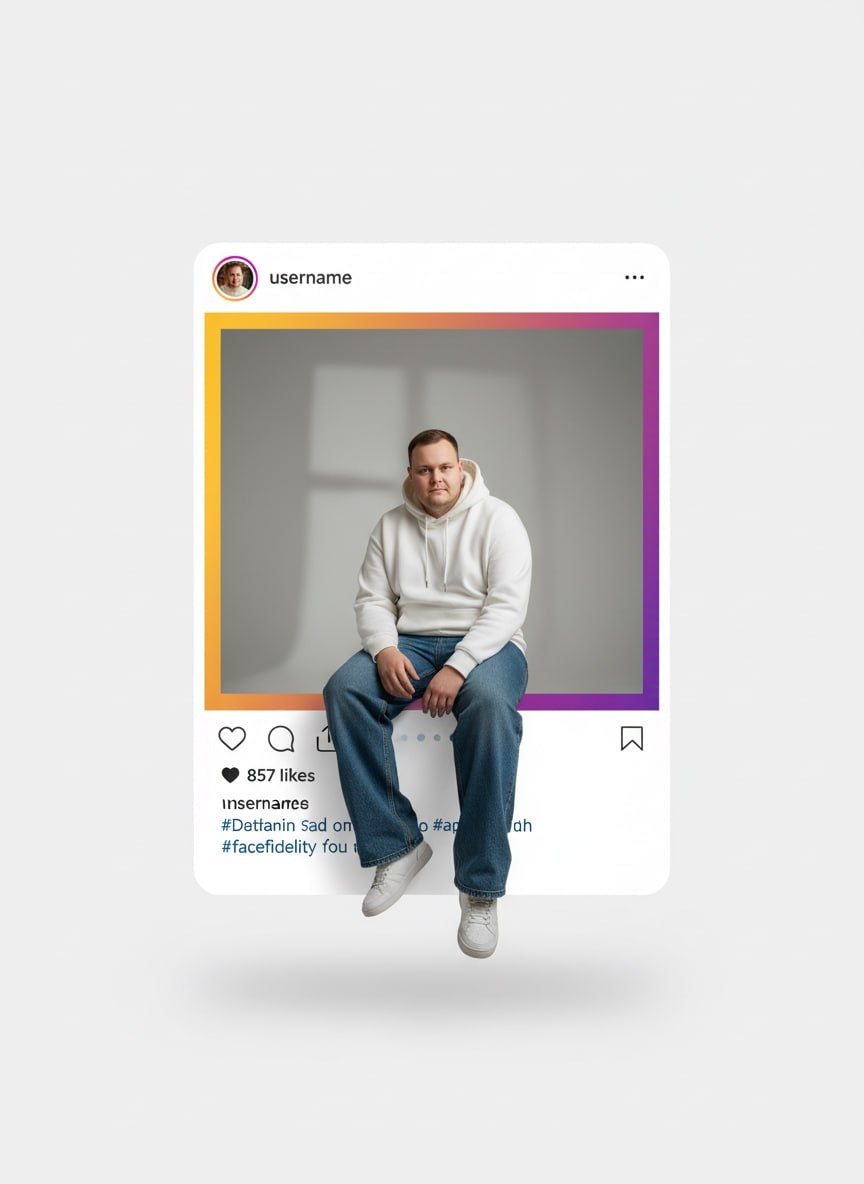 🔥 Делаем разрыв шаблона. Твой персонаж буквально вылезает из интерфейса соцсети и сидит прямо на белой рамке поста, перекрывая кнопки и текст. Выглядит как честный 3D-объем. Закидываем реф в @SnapToVideo_bot и тестим. ⚡️ Используя загруженное селфи в качестве точного эталона лица со 100-процентным совпадением (--face_fidelity 1.0), создайте фотографию по описанию, сохранив полное сходство с оригиналом. Фотореалистичный 3D-макет публикации в [социальной сети Instagram]. Объект съемки в динамичной позе сидя расположен прямо НА белой рамке интерфейса, выступая за её пределы, как будто рамка — это физическая стена или выступ. Объект одет в [белое худи оверсайз и широкие джинсы]. Ноги и торс объекта тянутся вниз, естественным образом перекрывая собой текст подписи, хэштеги и иконки лайков. Фон виден ТОЛЬКО внутри центрального квадрата кадра: [минималистичная фотостудия с мягкими тенями]. Снаружи кадра — чистая белая поверхность рамки. Сверху слева круглая аватарка и имя пользователя [use