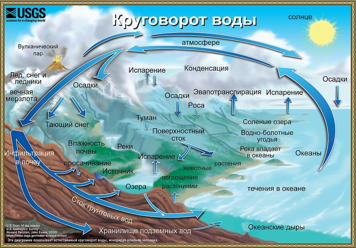 Вода, которую вы только что налили в стакан из-под крана, прошла невероятный путь. Она могла плескаться в океане, когда по его берегам бродили динозавры, подниматься паром над ледниками, замерзать в полярных льдах и течь в реках, которые видели рождение первых цивилизаций. Общий объём воды на Земле практически не меняется уже миллиарды лет — планета не теряет и не приобретает её сколько-нибудь заметно. Это значит, что вода, которую мы пьём сегодня, та самая, которую пили динозавры 100 миллионов лет назад . Круговорот воды в природе — самый грандиозный конвейер на планете, работающий без остановки с момента её рождения. В основе круговорота лежит простой физический процесс: под действием солнечного тепла вода испаряется с поверхности океанов, рек, озёр и даже с листьев растений. Водяной пар поднимается вверх, охлаждается, превращается в облака, а затем выпадает обратно на землю в виде дождя или снега. Примерно 80% всего испарения приходится на океан, и 90% осадков возвращается туда же,