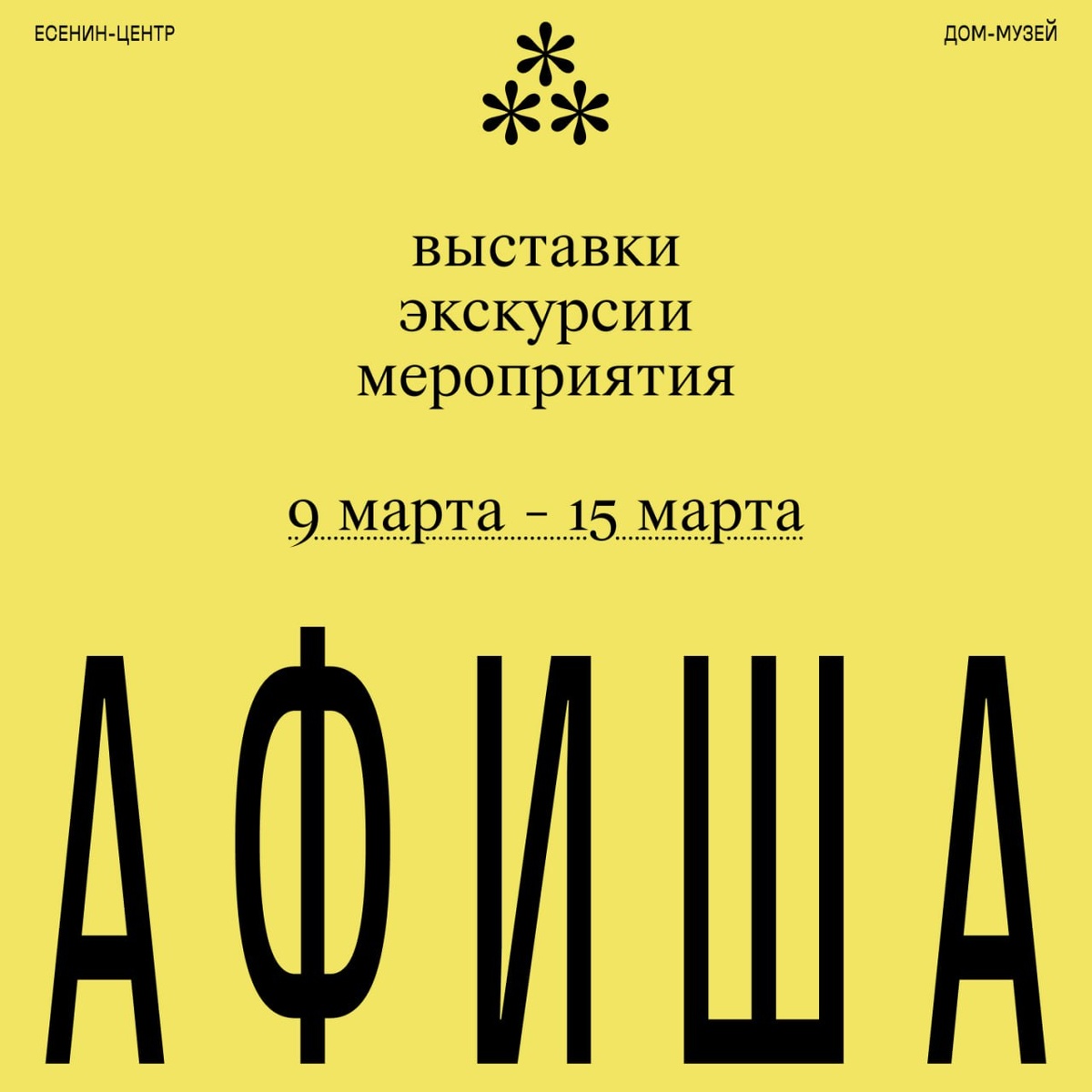 🍂🍂🍂🍂🍂 События в музее Есенина на неделю ВЫСТАВКИ: Есенин-центр (переулок Чернышевского, 4, стр. 2): ⚫️9-15 марта. Выставка "Черный человек. Исповедь поэта". ⚫️9-15 марта. Выставка "Поезд № 143". ⚫️9-15 марта. Выставка "Фронтовик Константин Есенин". Дом-музей С.А. Есенина (Большой Строченовский переулок, 24, стр. 2): 9-15 марта. Постоянная литературно-мемориальная экспозиция и выставка "Это все, что зовем мы Родиной...". МЕРОПРИЯТИЯ: Есенин-центр (переулок Чернышевского, 4, стр. 2): ⚫️12 марта в 19:30. Мастер-класс «Черный человек в мире супрематизма». По предварительной записи: +79296167182 (Вероника). ⚫️13 марта в 19:30. Концерт-спектакль "Ностальгия по настоящему". ⚫️14 марта в 18:00. Мастер-класс «Черный человек в мире супрематизма». По предварительной записи: +79296167182 (Вероника). ⚫️14 марта в 20:00. Спектакль "Бродский. Весна". ЭКСКУРСИИ: Есенин-центр (переулок Чернышевского, 4, стр. 2): ⚫️12 марта в 18:30. "Я один… И разбитое зеркало". Специальная экскурсионная