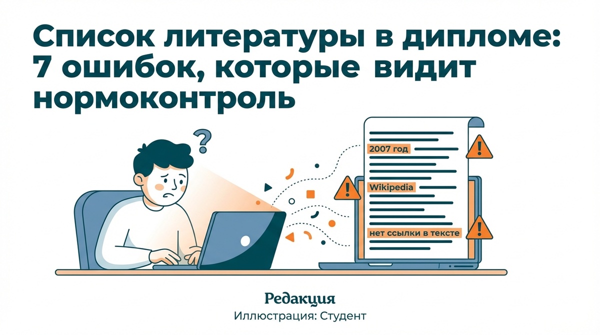 Список литературы — последний раздел диплома по порядку, но один из первых по тому, что смотрит нормоконтролёр. Именно из-за него чаще всего возвращают работу на доработку.