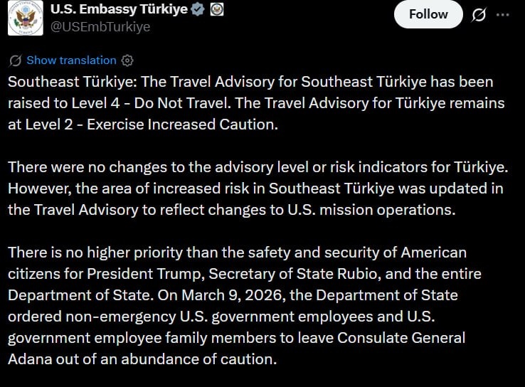 ❗️ US instructs its 'non-emergency' workers in Adana, Turkey Consulate to LEAVE