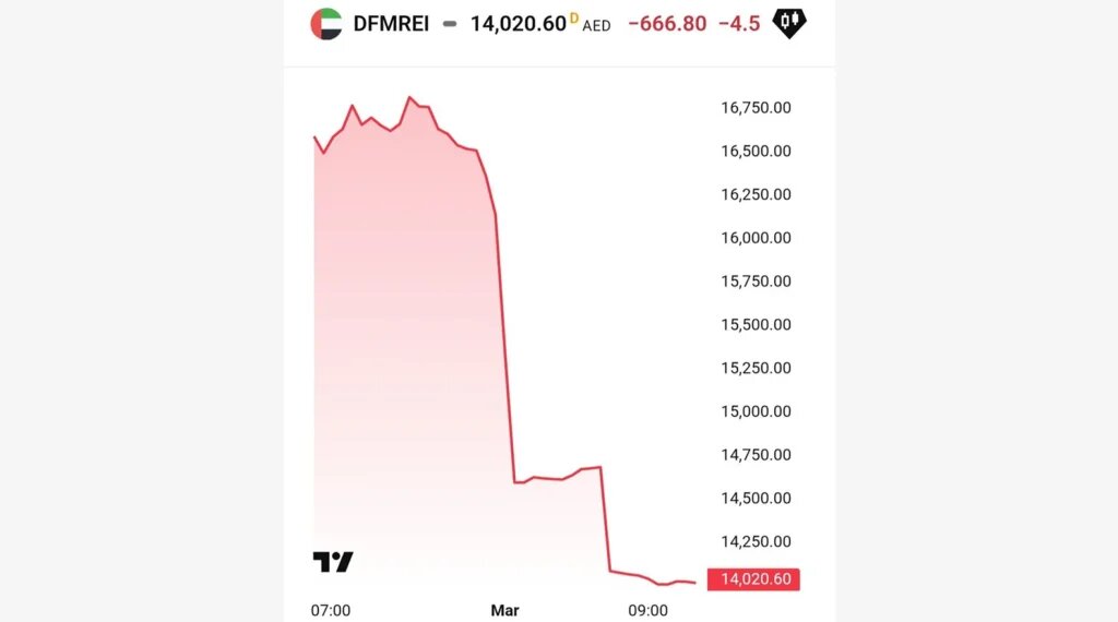 Он находится на отметке около 14,020 пунктов. Некоторые аналитики не исключают дальнейшего снижения цен на реальные объекты недвижимости до 40-50%, если конфликт затянется. Справочно: DFMREI — это биржевой индекс, отслеживающий динамику акций крупнейших компаний в сфере недвижимости.