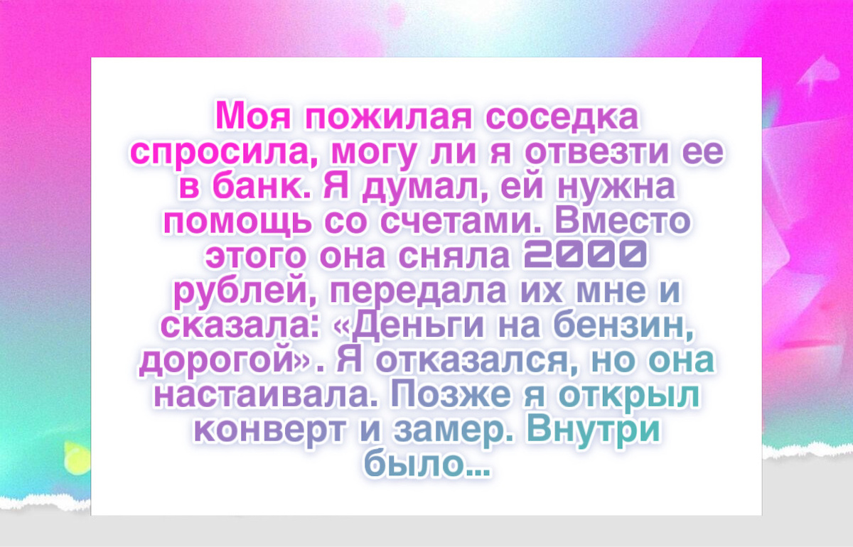 “Моя пожилая соседка попросила отвезти ее в банк. Я подумал, что ей нужна помощь с оплатой счетов. Но она сняла около 18000 рублей, протянула мне конверт и сказала: «Это на бензин, дорогой». Я отказался, но она настояла.