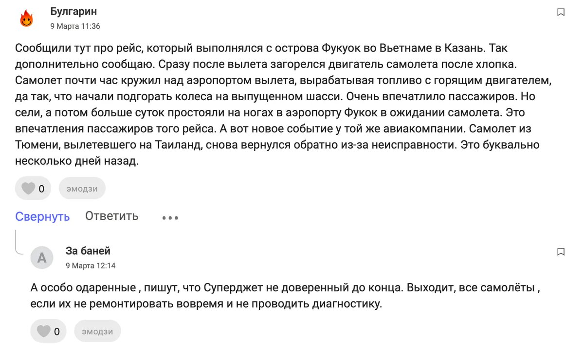 Самолёт Sukhoi Superjet 100 авиакомпании Red Wings (рейс WZ 1068) вскоре после вылета из Казани вернулся в аэропорт отправления из‑за неисправности шасси. Об этом сообщает РЕН ТВ со ссылкой на источник. Лайнер выполнял рейс Казань — Екатеринбург и поднялся в воздух в 08:00, следует из данных онлайн‑табло аэропорта Казани. На борту находились 85 пассажиров — по информации собеседника телеканала, пострадавших в результате инцидента нет. Напомним, что в конце февраля аналогичный случай произошёл с самолётом Boeing 767 авиакомпании Azur Air: борт, следовавший из Вьетнама (остров Фукуок) в Казань, вернулся в аэропорт вылета из‑за технического сбоя. После этого компания временно вывела лайнер из эксплуатации. Читатели «БИЗНЕС Online» в комментариях начали делиться историей про рейс из Вьетнама в Казань. Фото: Скриншот комментариев к новости на сайте «БИЗНЕС Online» Ранее мы писали, что в аэропорту Казани исполнят давнюю просьбу пассажиров — откроют курительную кабину.