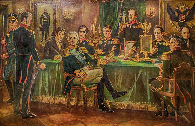 И.А. Набоков в период следствия над декабристами командовал 3-ей пехотной дивизией. В январе 1826 г. в Могилёве он возглавил комиссию военного суда над участниками восстания Черниговского полка. В Могилеве, не в Санкт-Петербурге. И это почти единственный член изображенного на картинке ареопага, который действительно имел отношение к суду над декабристами. Почему «почти» - ниже.