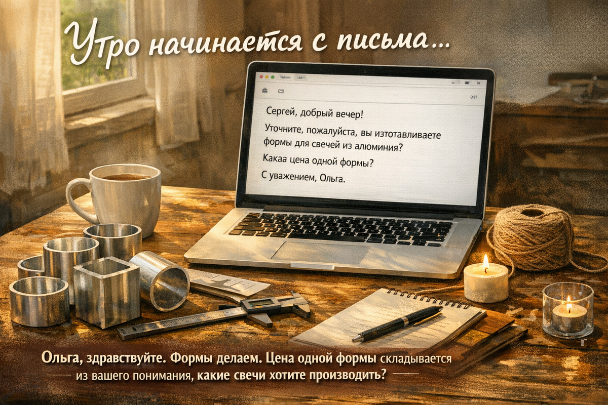 Утро начинается с письма. «Сергей, добрый вечер! Уточните, пожалуйста, вы изготавливаете формы для свечей из алюминия? Какая цена одной формы? С уважением, Ольга».