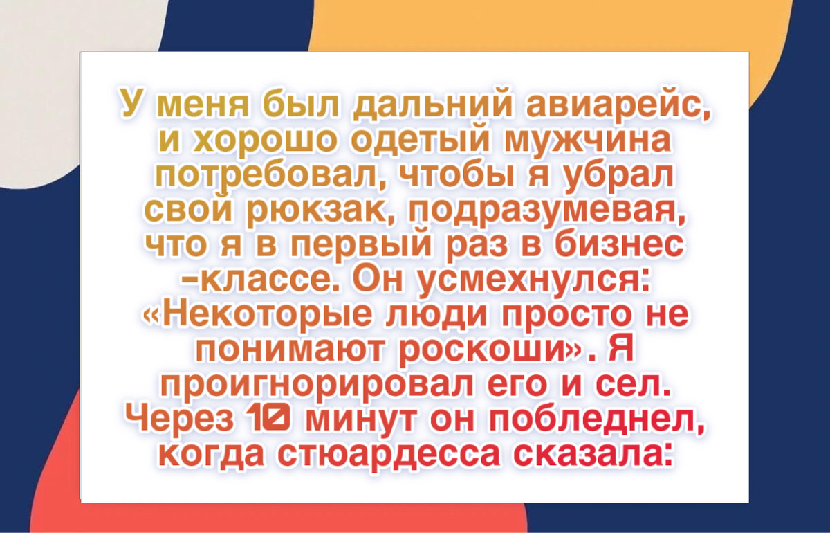 “Я сел на длительный авиарейс, и рядом оказался очень хорошо одетый мужчина. Он потребовал убрать мой рюкзак и дал понять, что я якобы не должен сидеть в бизнес классе. С презрением сказал: «Некоторые люди просто не понимают, что такое роскошь».