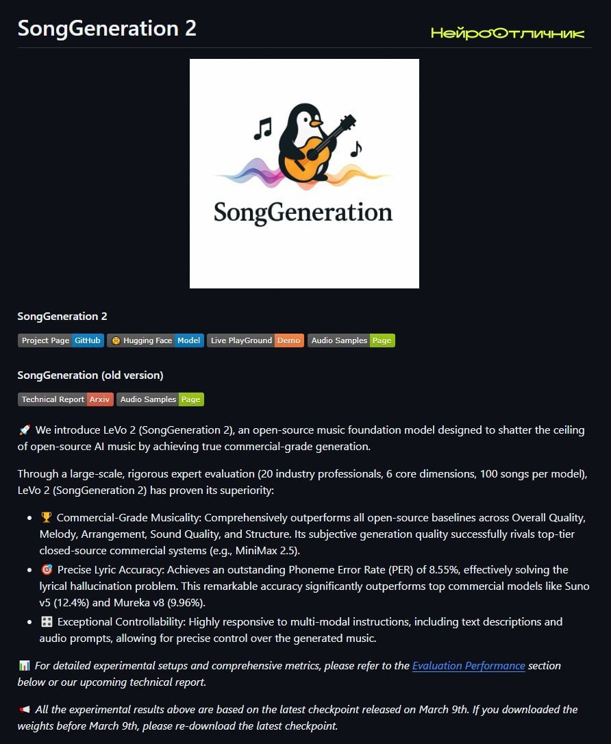 LeVo 2 — новая версия нейросети для генерации музыки — вышла на новый уровень. Система работает на 4 млрд параметров, обеспечивает точную передачу текста песен (ошибается всего в 8,55%) и выдает треки до 4,5 минут. Можно создавать музыку по тексту или аудио, а также разделять вокал и инструментал. Для старта потребуется GPU с 10 ГБ VRAM — серьёзно, но вполне реально. Попробовать LeVo можно на GitHub и в демо на HuggingFace. Как думаете, звучит лучше AceStep1.5? Подписывайтесь, чтобы не пропустить новинки! #музыка #искусственныйинтеллект #технологии Нейро Отличник www.neurootlichnik.ru
