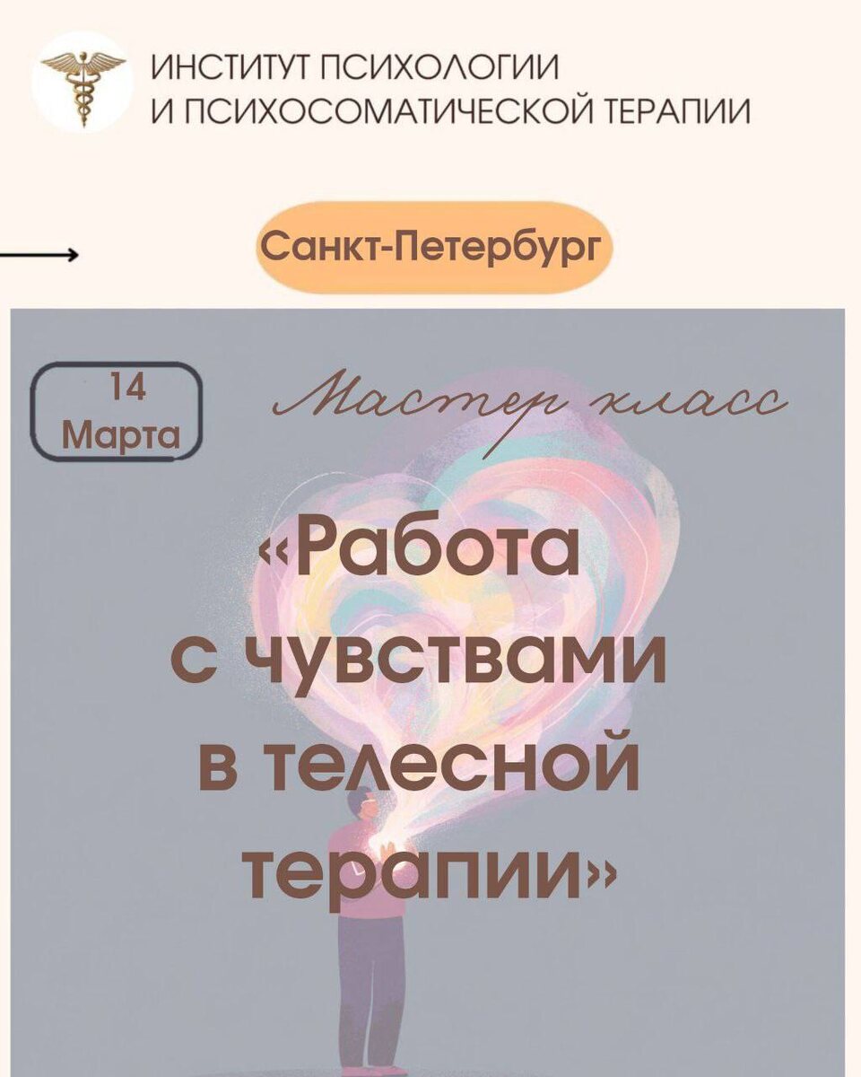 В мегаполисах и джунглях интернета, где много иллюзий и подделок, теряются свои ИСТИННЫЕ чувства и эмоции, которые живут в нашем Теле и находят отклик в нашем сердце 💔 ИПиПТ Санкт-Петербург 14 марта с 19:00 до 21:30 ждет вас на мастер-класс «Работа с чувствами в телесной терапии». На мастер классе мы исследуем: ✨Чувства и эмоции как способ адаптации, виды чувств и эмоций ✨Нейрофизиология чувств и эмоций ✨Звенья эмоциональной саморегуляции ✨Практики работы с чувствами и эмоциями в телесном подходе Ведущая МК: Фоллетт Ирина Борисовна, врач-психотерапевт, врач-психиатр, медицинский психолог, телесный терапевт, психосоматотерапевт, полевой терапевт, преподаватель программ повышения квалификации Института Психологии и Психосоматической Терапии. Действительный член Профессиональной Ассоциации Телесных и Психосоматических терапевтов. Стоимость МК по предоплате 2000 руб., в день мероприятия (при наличии мест)-2500 руб. Можно приобрести сертификат Института о прохождении мастер-класс