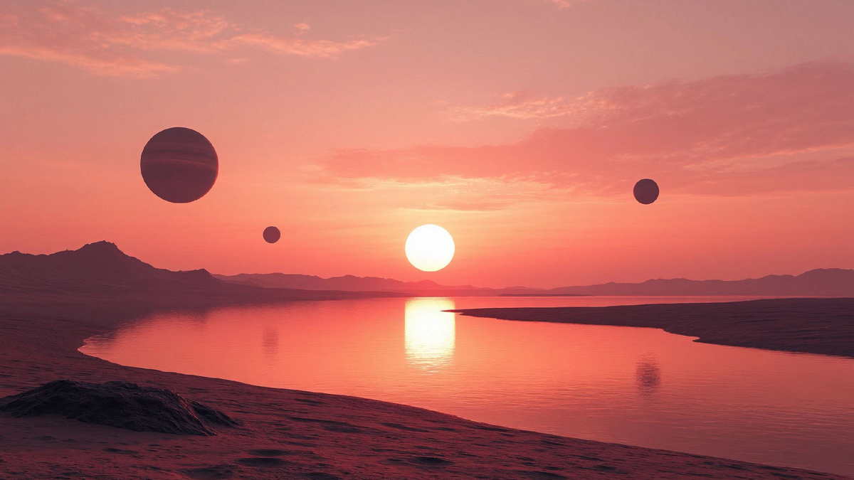 Представьте себе: вы стоите на берегу океана, но небо над вами не голубое, а нежно-розовое. В небе висят не одна луна, а шесть огромных планет-сестер, занимающих четверть небосвода. Солнце здесь — багровый шар, который никогда не движется по небу, а висит низко над горизонтом в вечном закате.