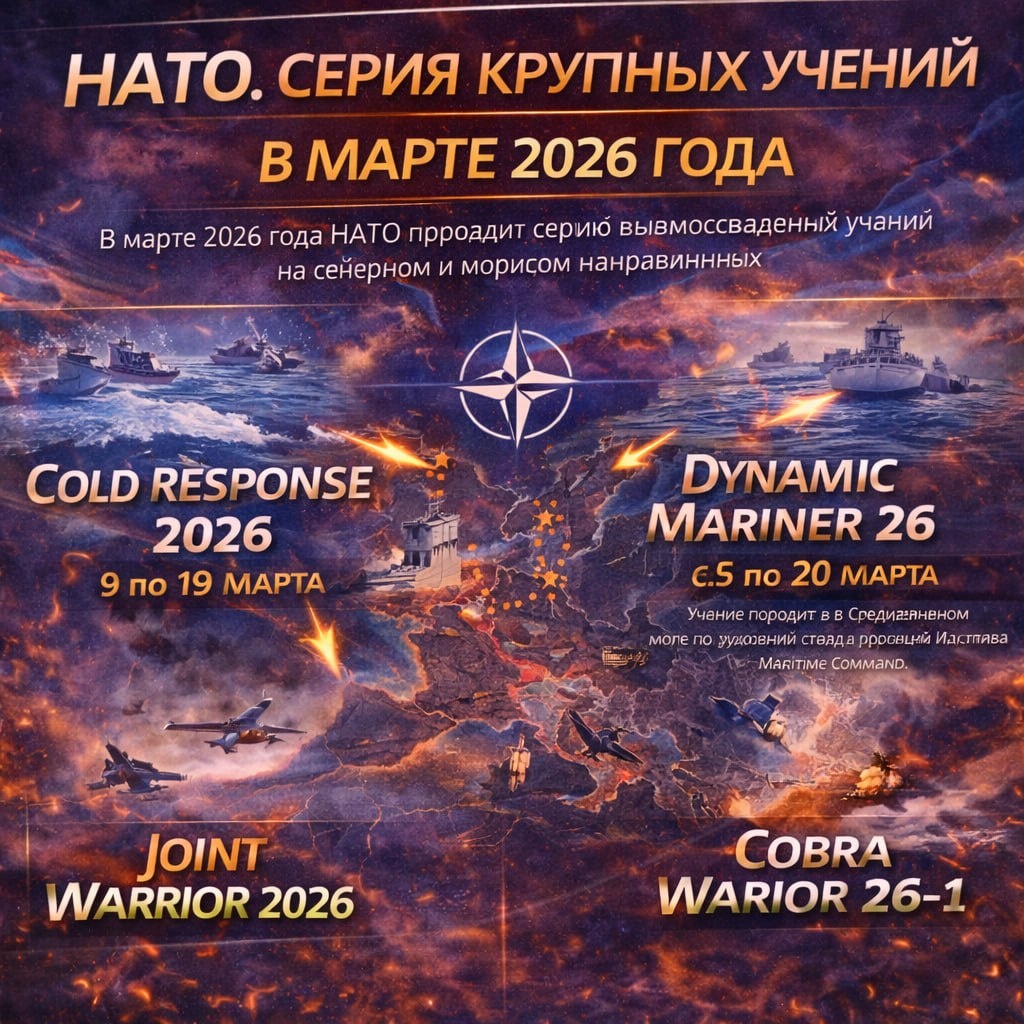СЕРИЯ КРУПНЫХ УЧЕНИЙ В МАРТЕ 2026 ГОДА В марте 2026 года НАТО проводит серию взаимосвязанных учений на северном и морском направлениях. Манёвры охватывают арктический театр, Средиземное море, Северную Атлантику и воздушное пространство Европы. Основная задача — проверка способности альянса быстро развернуть многонациональную группировку, обеспечить её управление и вести боевые действия высокой интенсивности на нескольких театрах одновременно. Cold Response 2026 с 9 по 19 марта Учение проводится в Северной Европе на территории Норвегии, Финляндии и Швеции. Общая численность задействованных сил составляет около 25 тыс. военнослужащих из 14 государств НАТО. На территории Норвегии действует около 11 850 военнослужащих СВ. США привлекли около 3 тыс. морских пехотинцев, ССО и авиацию. Финляндия задействовала около 3 500 военнослужащих, включая до 2 000 резервистов. Швеция – около 3 000 военнослужащих, включая подразделения 4-й бригады. Учение проводится в северной Норвегии и Финляндии, на м