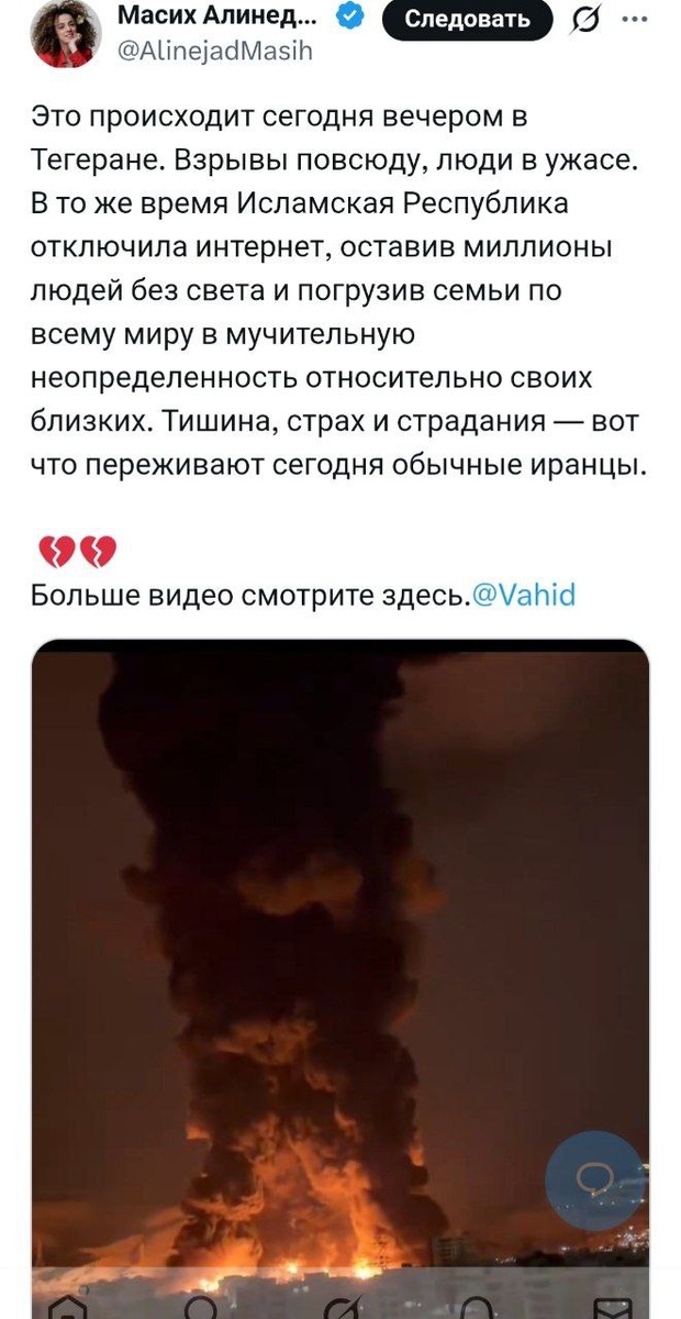 Перед этим она получили 800000 долларов от правительства США. Известная блогерша перешла в The Guardian и уверяла, что пора атаковать Иран из-за убийств 30000 человек. Цифры взяты с потолка проамериканскими организациями и формировали общественное мнение для начала войны. Теперь журналистка собирает лайки на статью о том, что бомбы США привели Иран к катастрофе. Такие же сети оппозиционеров и СМИ выстроены вокруг Китая, России, Индии и других крупных стран 📶 Новости Ближнего Востока