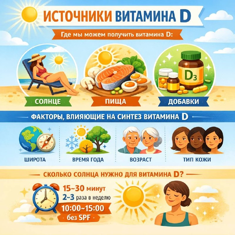 Витамин D — это жирорастворимый витамин, который играет ключевую роль в: • обмене кальция и фосфора • здоровье костной ткани • работе иммунной системы • регуляции метаболических процессов Основные источники витамина D: ☀️ солнечный свет 🥗 пищевые продукты 💊 витаминные добавки Разберём каждый из них. ☀️ Солнечный свет — главный источник витамина D Под воздействием ультрафиолетового излучения UVB (длина волны 290–315 нм) в коже синтезируется витамин D₃ (холекальциферол). Этот процесс происходит в эпидермисе из предшественника — 7-дегидрохолестерина. У большинства людей короткое пребывание на солнце 2–3 раза в неделю может способствовать образованию достаточного количества витамина D. 📊 Интересный факт: однократное воздействие минимальной эритемной дозы ультрафиолета (количество, вызывающее лёгкое покраснение кожи) может привести к синтезу витамина D, сопоставимому с приёмом около 20 000 МЕ витамина D внутрь. Но на практике синтез витамина D сильно зависит от разных факторов. ⚙️ Фак