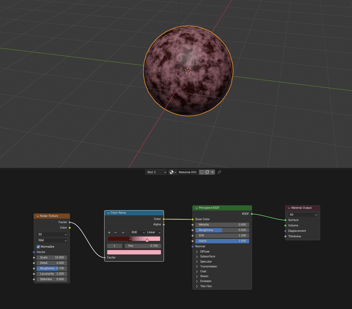 Сегодня создаем процедурную текстуру в Blender с помощью нода Noise Texture. Процедурные текстуры генерируются алгоритмом и не требуют загрузки изображений, поэтому их удобно использовать для экспериментов с материалами и для создания базовых поверхностей. Для упражнения я создала простой объект и новый материал. В Shader Editor добавила нод Noise Texture через Shift + A → Texture → Noise Texture. Затем подключила его к входу Base Color в шейдере Principled BSDF. После этого можно сразу увидеть процедурный узор на поверхности объекта. Основные параметры Noise Texture, которые влияют на результат: Чтобы сделать текстуру более управляемой, между Noise Texture и Base Color можно добавить нод ColorRamp. С его помощью удобно регулировать контраст и выбирать цветовую палитру материала. Даже такое простое упражнение показывает, как работает нодовая система Blender. Комбинируя процедурные текстуры, можно создавать сложные материалы — например камень, мрамор, грязь или абстрактные поверхности.