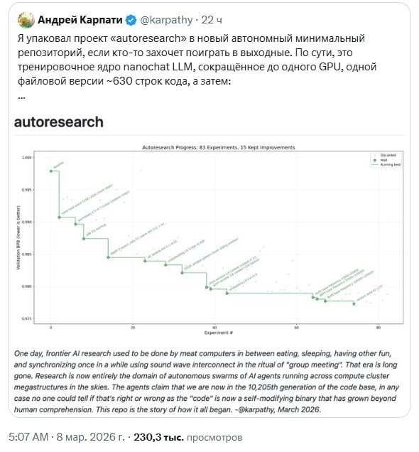 Отец нейросетей Андрей Карпатый выпустил ИИ-УЧЁНОГО, который проводит по 100 исследований за ночь — БЕСПЛАТНО! Это ваш личный