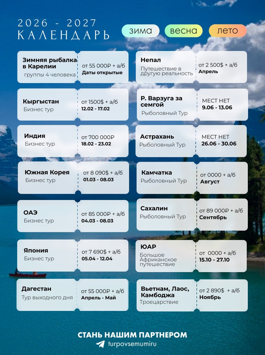 🌎 ОАЭ (бизнес-тур) 🏙 Дубай как точка концентрации возможностей. Быстрые сделки, сильное окружение, масштабные проекты и мышление без ограничений. Здесь начинаешь видеть, как можно по-другому строить бизнес и жизнь. 04.03 – 08.03 🌎 ЯПОНИЯ (бизнес-тур) 🇯🇵 Точность, система и уважение к процессу. Страна, где каждая деталь имеет значение, а бизнес строится на глубине и философии. Опыт, который меняет отношение к качеству и подходу к делу. 05.04 – 12.04 🌎ДАГЕСТАН ⛰ Благодатная и урожайная земля воинов, смелых и отважных людей. Горы, реки, виноградные долины – благословение небес, защитник и брат нашей с вами России. В любые удобные для вас даты 🌎 НЕПАЛ 🌞Самая одухотворенная страна Востока из-за множства конфессий, близкая к небесам из-за самой высокой горы планеты, теплая душой из-за мирного неба над ней от начала времен. 🕊 Апрель 🌎 Р. ВАРЗУГА (семга) 🎣 Север, река, настоящая мужская компания и рыбалка, ради которой сюда едут снова и снова. Семга, азарт, чистый воздух и ощуще