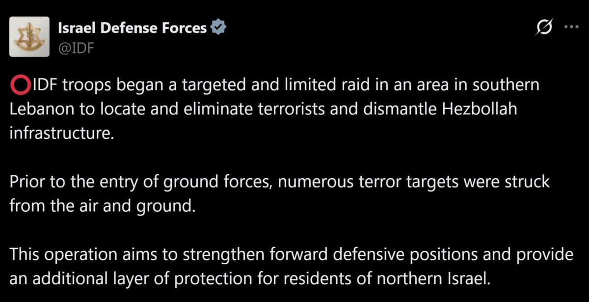 ⚡️ IDF announces that its ground forces have entered Lebanese territory