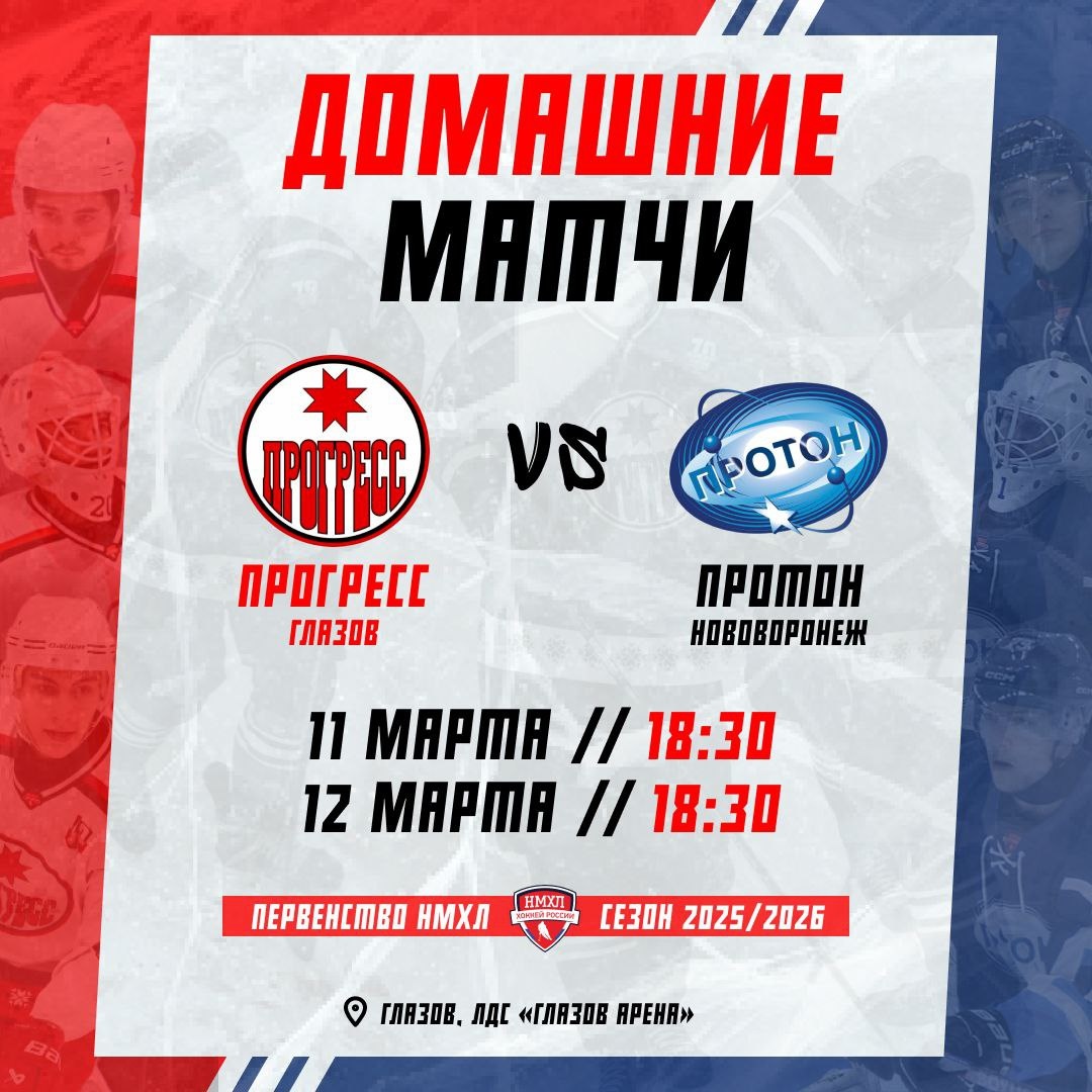 Домашняя серия матчей продолжается. В борьбе за плей-офф сыграем с одним из главных конкурентов ХК Протон. Матчи пройдут 11 и 12 марта в 18:30. Ждем всех на трибунах Глазов Арены.