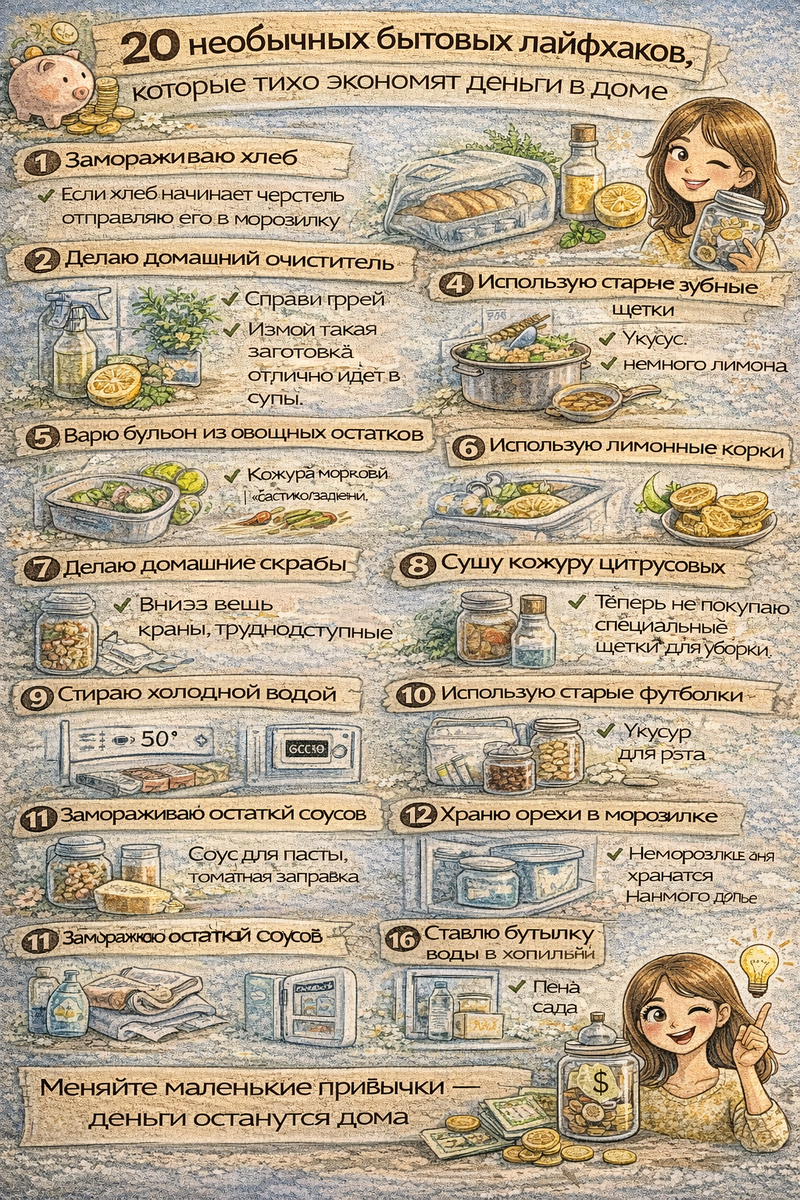 А из-за мелких бытовых привычек, которые мы даже не замечаем. Иногда достаточно изменить одну маленькую деталь — и расходы становятся меньше. Вот 20 необычных бытовых лайфхаков, которые я постепенно внедрила у себя дома. Если хлеб начинает черстветь — отправляю его в морозилку. Потом достаю по кусочкам и разогреваю в тостере. Хлеб снова мягкий.