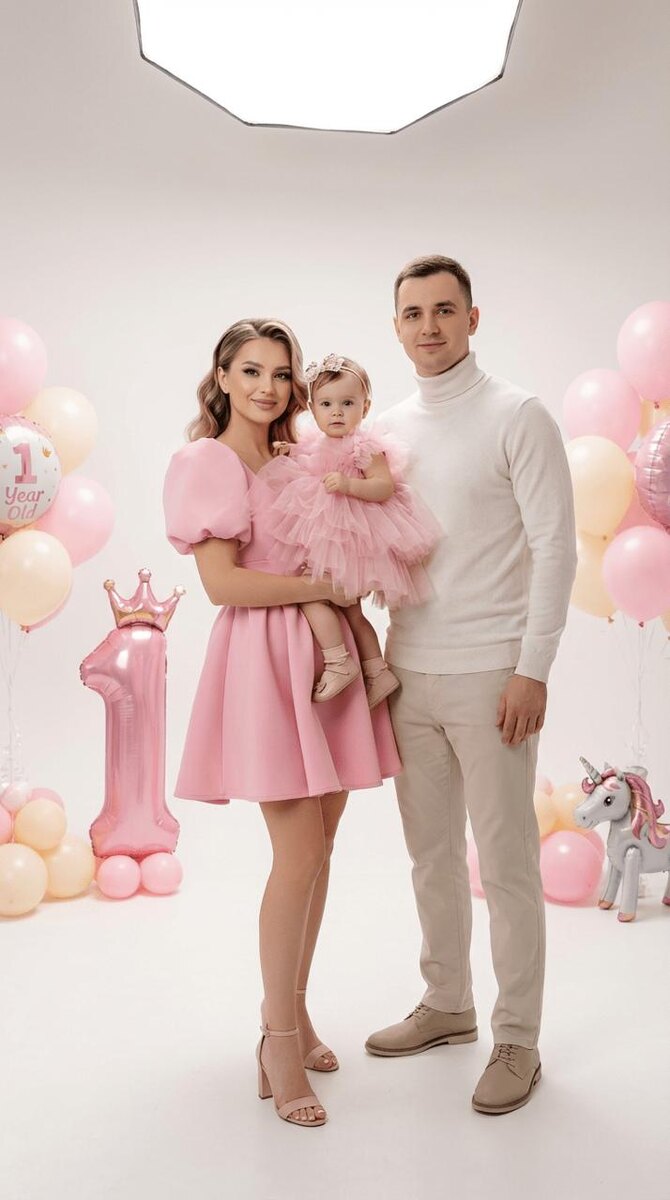 Модель: Nano Banana Сгенерировать🪄 Используй лица мужчины, женщины и ребенка с загруженнных фото. Студийный семейный портрет в полный рост. Мужчина и женщина стоят рядом, женщина держит на руках маленького ребенка. Все трое смотрят прямо в камеру. Женщина с ребенком на руках, мужчина стоит справа от нее, чуть ближе к зрителю. Ребенок смотрит в объектив. У женщины аккуратный студийный макияж. Тон лица ровный, матовый. Ресницы длинные, темные. Веки покрыты мягкими нейтрально-розовыми тенями с легким затемнением внешних уголков. По линии роста ресниц тонкая подводка. Губы окрашены в нюдово-розовый оттенок с сатиновым финишем. На женщине короткое розовое платье с пышной юбкой из гладкой плотной ткани. Рукава объемные, короткие. Талия подчеркнута. Обувь — босоножки на каблуке светло-розового оттенка. Волосы уложены в мягкие волны с боковым пробором. Ребенок одет в пышное многослойное платье из розового фатина. На голове декоративный бант. На ногах светлые носочки и туфельки. На мужчине мо