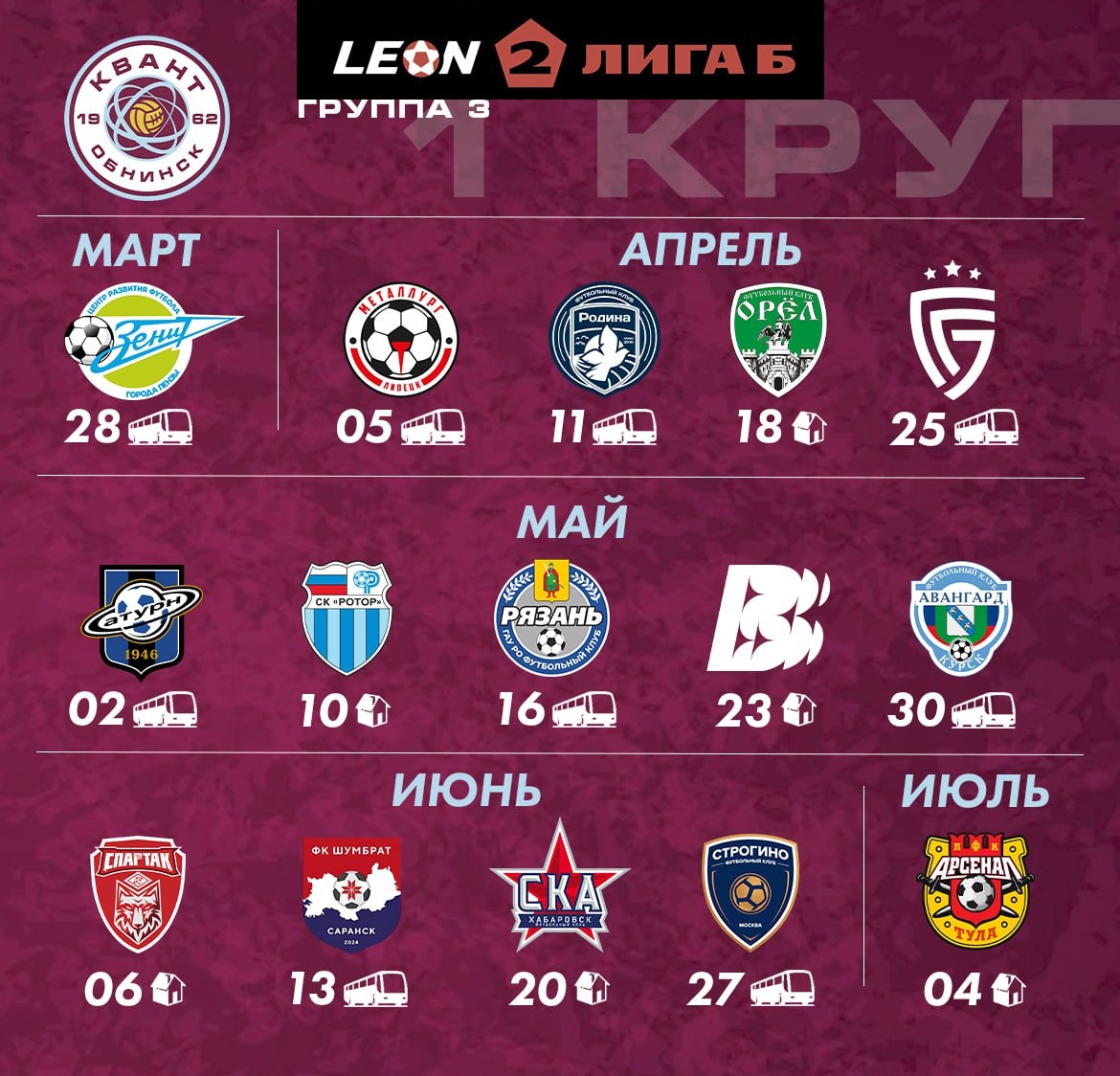 По сравнению с первоначальным вариантом уже произошло одно изменение - матч 2 тура против липецкого "Металлурга" 🔴проведём в воскресенье 5 апреля на выезде. По согласованию между клубами мы поменялись кругами. Таким образом, первые три тура ФК "Квант"💠 сыграет на чужом поле, а первый домашний матч в новом сезоне состоится 18 апреля, когда мы примем ФК "Орёл" 🦅. Обратим внимание, что это по-прежнему предварительный календарь, и изменения ещё возможны: 01 тур – 28.03 – Зенит (Пенза) 🆚 Квант (Обнинск) 02 тур – 05.04 – Металлург (Липецк) 🆚 Квант (Обнинск) 03 тур – 11.04 – Родина-3 (Москва) 🆚 Квант (Обнинск) 04 тур – 18.04 – Квант (Обнинск) 🆚 Орёл 05 тур – 25.04 – Салют Белгород 🆚 Квант (Обнинск) 06 тур – 02.05 – Сатурн (Раменское) 🆚 Квант (Обнинск) 07 тур – 10.05 – Квант (Обнинск) 🆚 Ротор-2 (Волгоград) 08 тур – 16.05 – Рязань 🆚 Квант (Обнинск) 09 тур – 23.05 – Квант (Обнинск) 🆚 Волна (Нижегородская область) 10 тур – 30.05 – Авангард (Курск) 🆚 Квант (Обнинск) 11 тур – 06.06