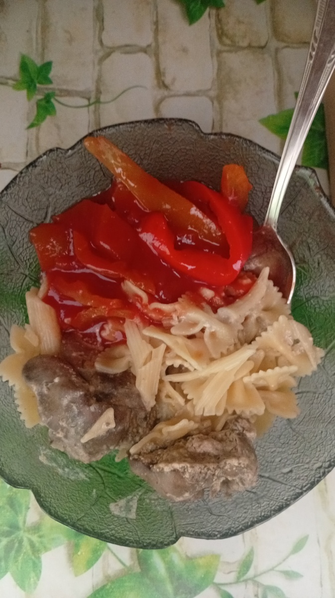 На видео снимать не было никакого настроения, я печёнку люблю готовить в сливочном масле, с достаточным количеством сметаны, а сегодня я налила немного растительного масла на сковороду, выложила куриную печень, остатки сметаны развела водой и вылила в сковородку. Потушила. Отварила остатки разной формы макаронных изделей из двух пачек, ну чтобы не открывать новую килограмовую упаковку. И банку